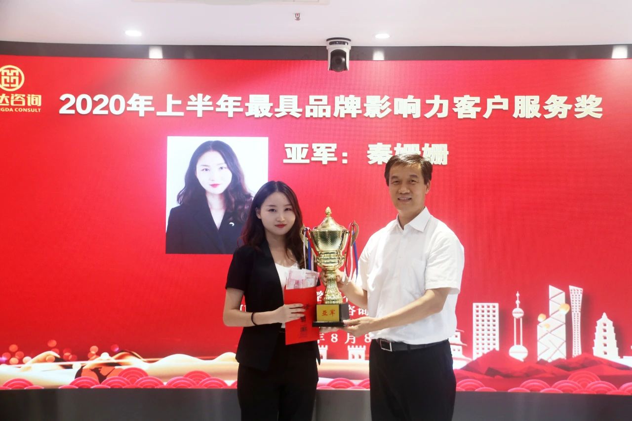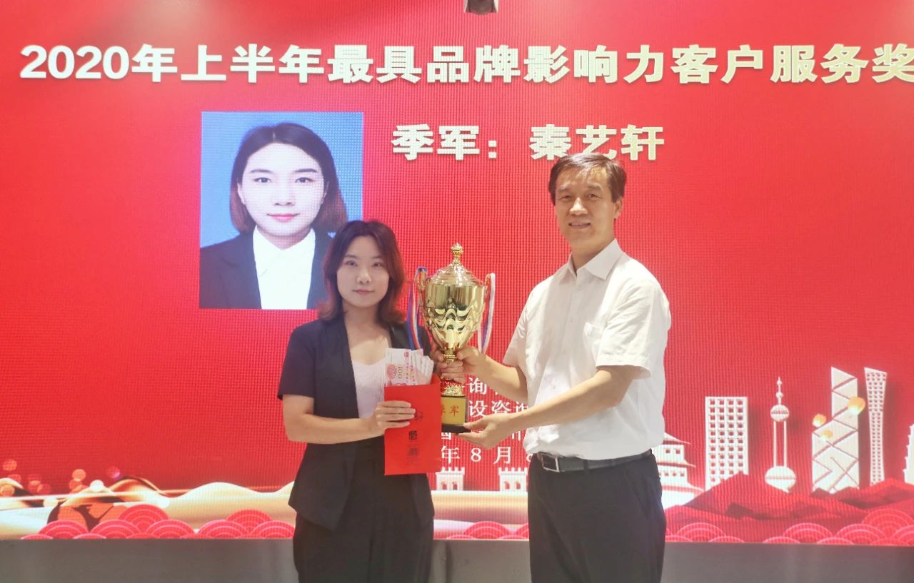 董事長楊明宇為在2020年上半年客戶服務工作中表現(xiàn)突出的先進個人頒發(fā)獎杯和獎金。