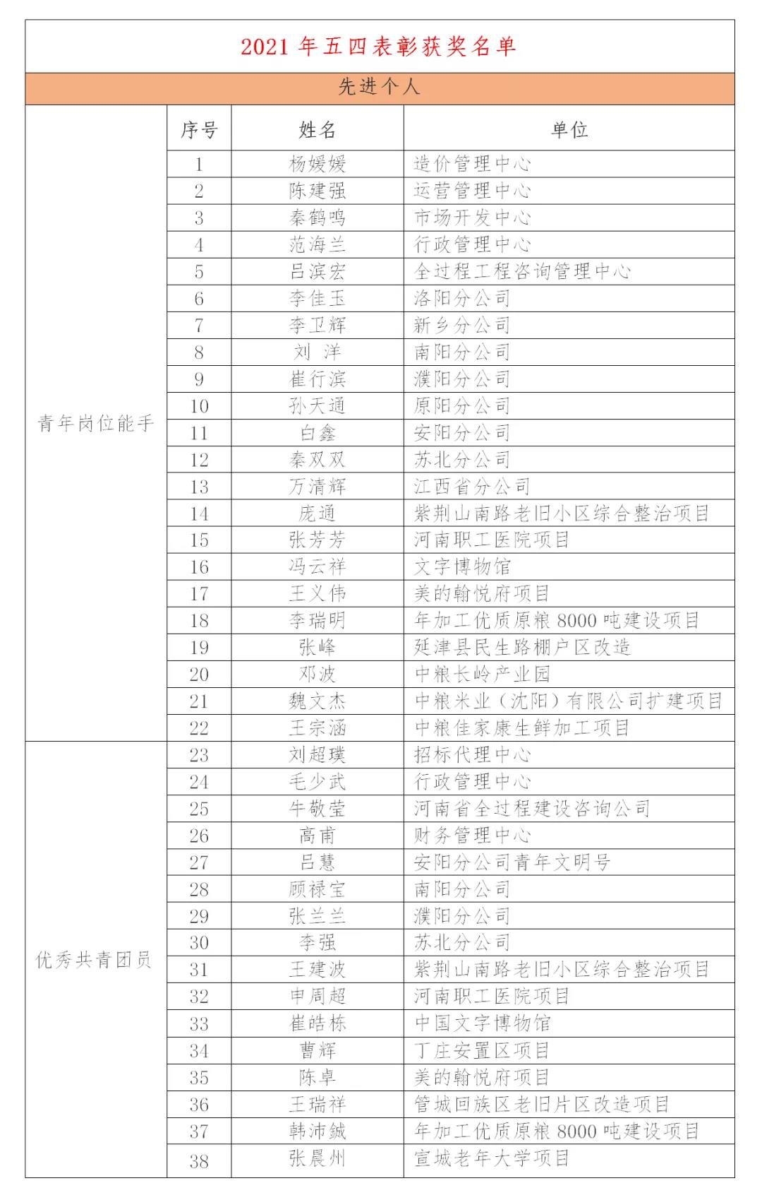 根據(jù)評選表彰辦法,在對候選對象進行初評、考察、復核的基礎上,經(jīng)評委會審議,現(xiàn)對擬表彰個人(集體)進行公示。決定授予楊媛媛、崔行濱等22人為“青年崗位能手”、授予李勁、張尚新等20人為“匠心服務標兵”,授予申周超、呂慧等22人為“優(yōu)秀共青團員”,授予嚴巍、平治中等5人為“青年創(chuàng)業(yè)標兵”;授予新鄉(xiāng)分公司、南陽分公司等為“創(chuàng)新創(chuàng)業(yè)先進集體”,授予濟源分公司、原陽分公司等為“志愿服務先進集體”,授予濮陽分公司、洛陽分公司等為“青年文明號”(詳細名單見附件)。